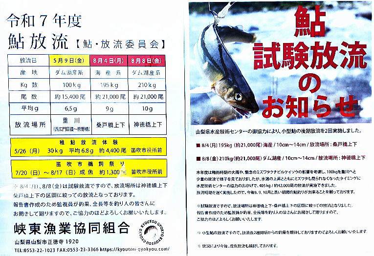 峡東漁協管内(笛吹川・重川・日川等)の鮎釣り情報詳細は峡東漁協のホームページをご覧ください |