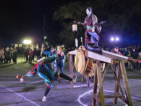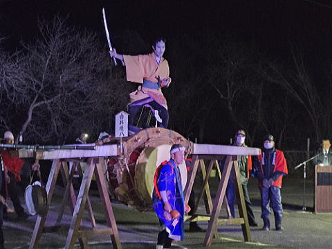 | 山梨県甲州市塩山藤木にある放光寺の駐車場で4年ぶりに小正月行事の「藤木道祖神祭太鼓乗り」が開催されました。赤々と燃えた焚火を囲み、3人の歌舞伎役者に扮した地元の方が大太鼓の上で掛け合う口上がとても味があり素晴らしいものでした。 |