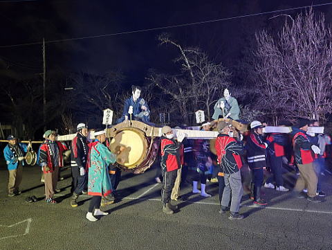 2025年1月12日(日)山梨県甲州市塩山藤木にある放光寺の駐車場で夜の7時頃から恒例の太鼓乗りが催されました。今夜も冷え込みましたが風もなく、大きな焚火を囲んで今年もユニークな太鼓乗りが披露されました。
